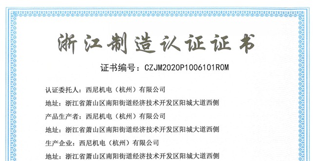 推進(jìn)“浙江制造”品牌 ——西尼機(jī)電榮獲“品字標(biāo)浙江制造”認(rèn)證證書!
