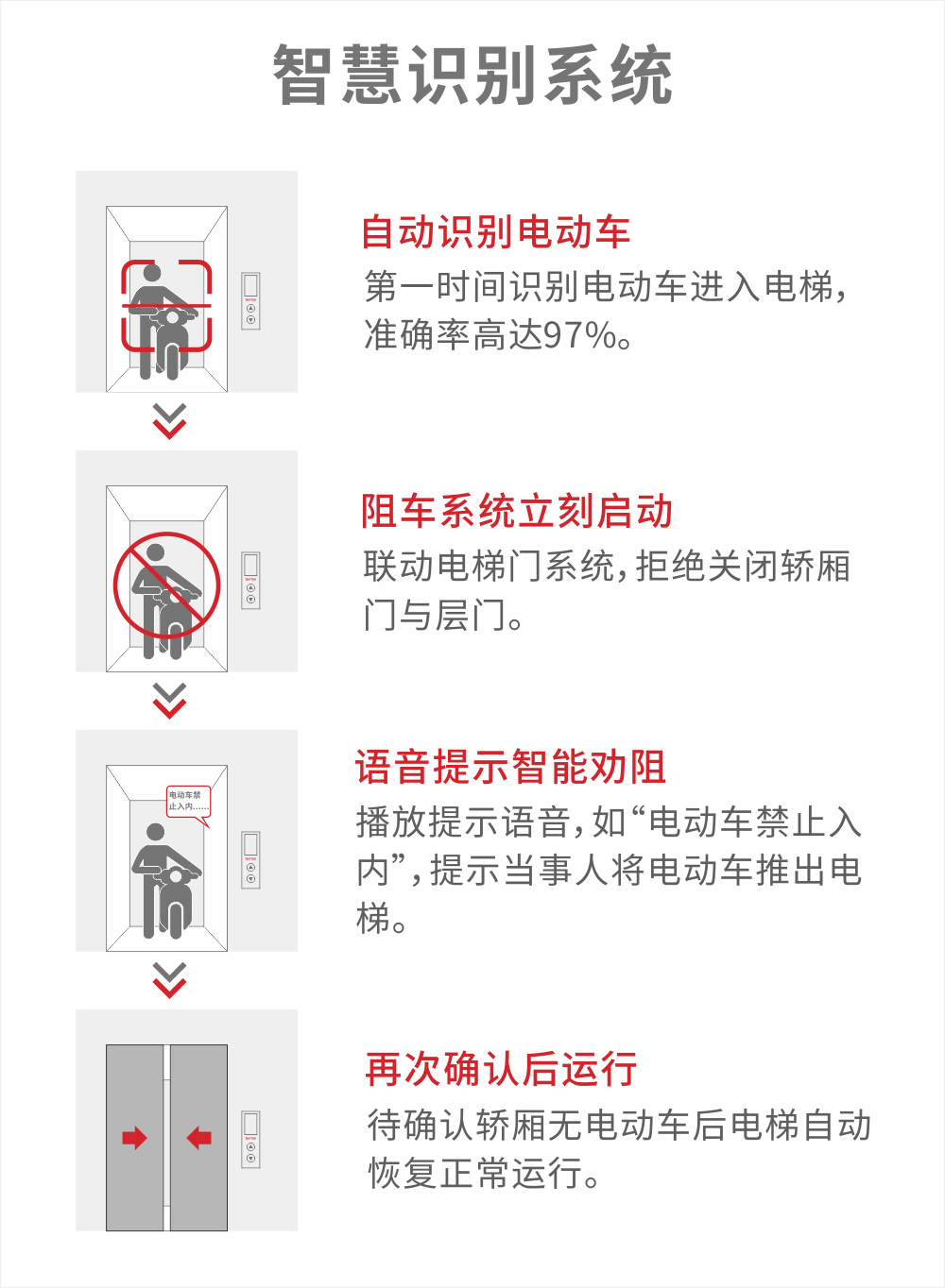 火患猛于虎,電動(dòng)自行車禁止入樓入戶,這不僅是對自己,也是對別人的生命負(fù)責(zé)。電動(dòng)車一旦自燃著火,不僅溫度急速提升,同時(shí)還會(huì)伴隨大量有毒濃煙,極易引發(fā)傷亡事故?,F(xiàn)在全國各地都在嚴(yán)抓的同時(shí),還建議為電梯安裝“智慧識(shí)別系統(tǒng)”,可作為保障業(yè)主生命財(cái)產(chǎn)安全的又一道堅(jiān)固防線。